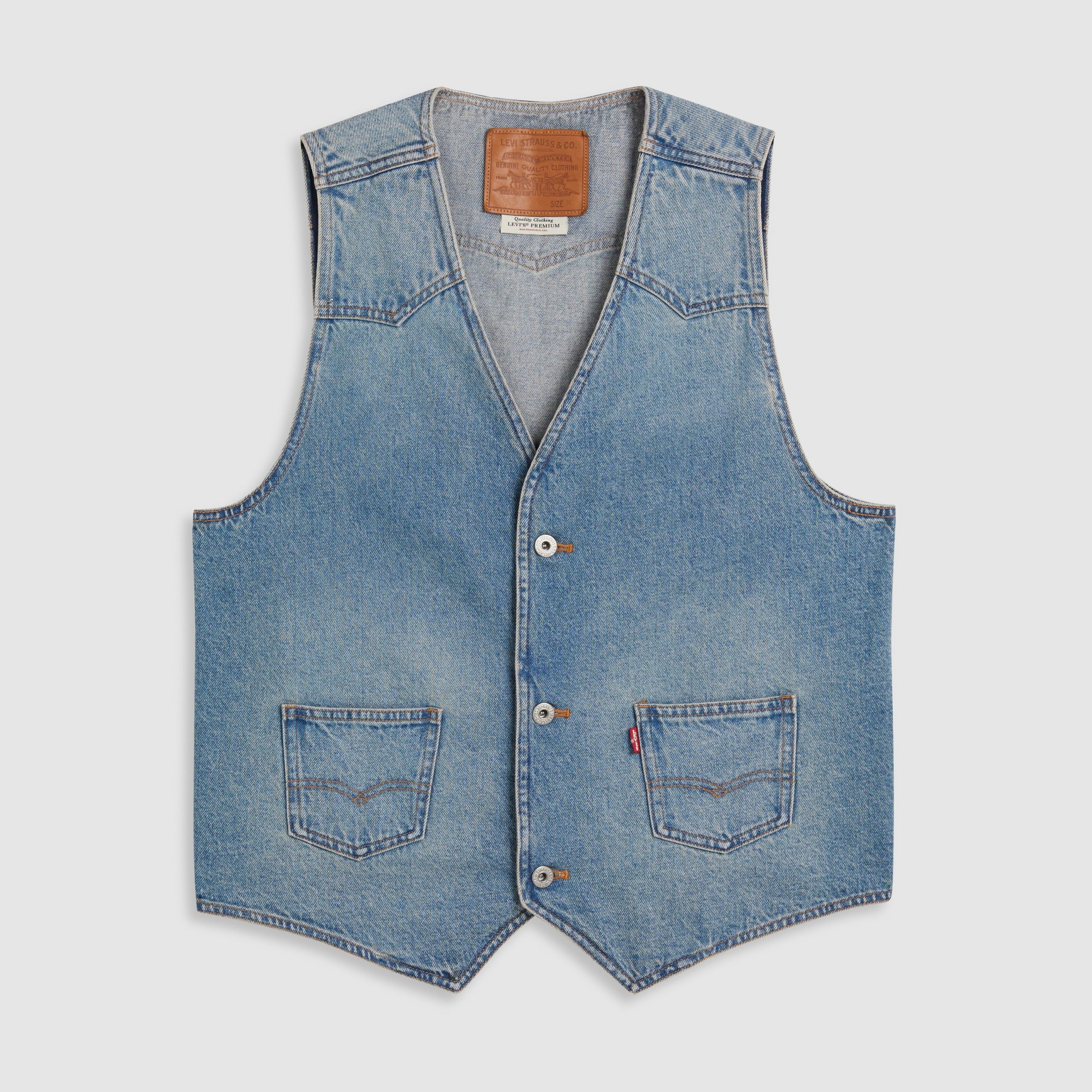 Classic and versatile. our Mission Denim Vest keeps things timeless with a button-up front. a standard fit and classic. non-stretch denim.